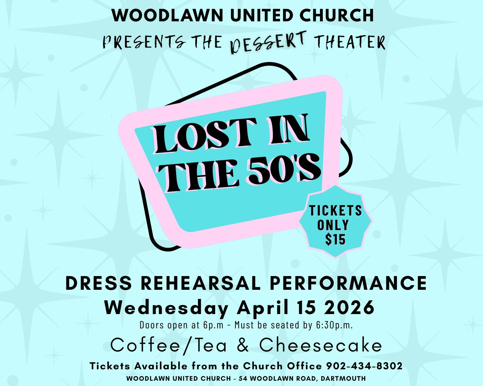 PS As many of you know our dinner theatre musical “Lost in the 50’s” has been sold out for months (April 17 &18). Recently we have decided to offer another show, Wednesday April 15 at 6:30 pm, this one without a full meal, instead a dessert of cheesecake, the price lower at $15. These tickets are selling fast. If you want to go call the office at 902-434-8302, Tuesday-Friday, 9 am – 4 pm. The songs/dances are coming along very well. I am “the weakest link” in song/dance, but I try to make up for it being the loudest cast member, the only one not mic’d for the evening.
