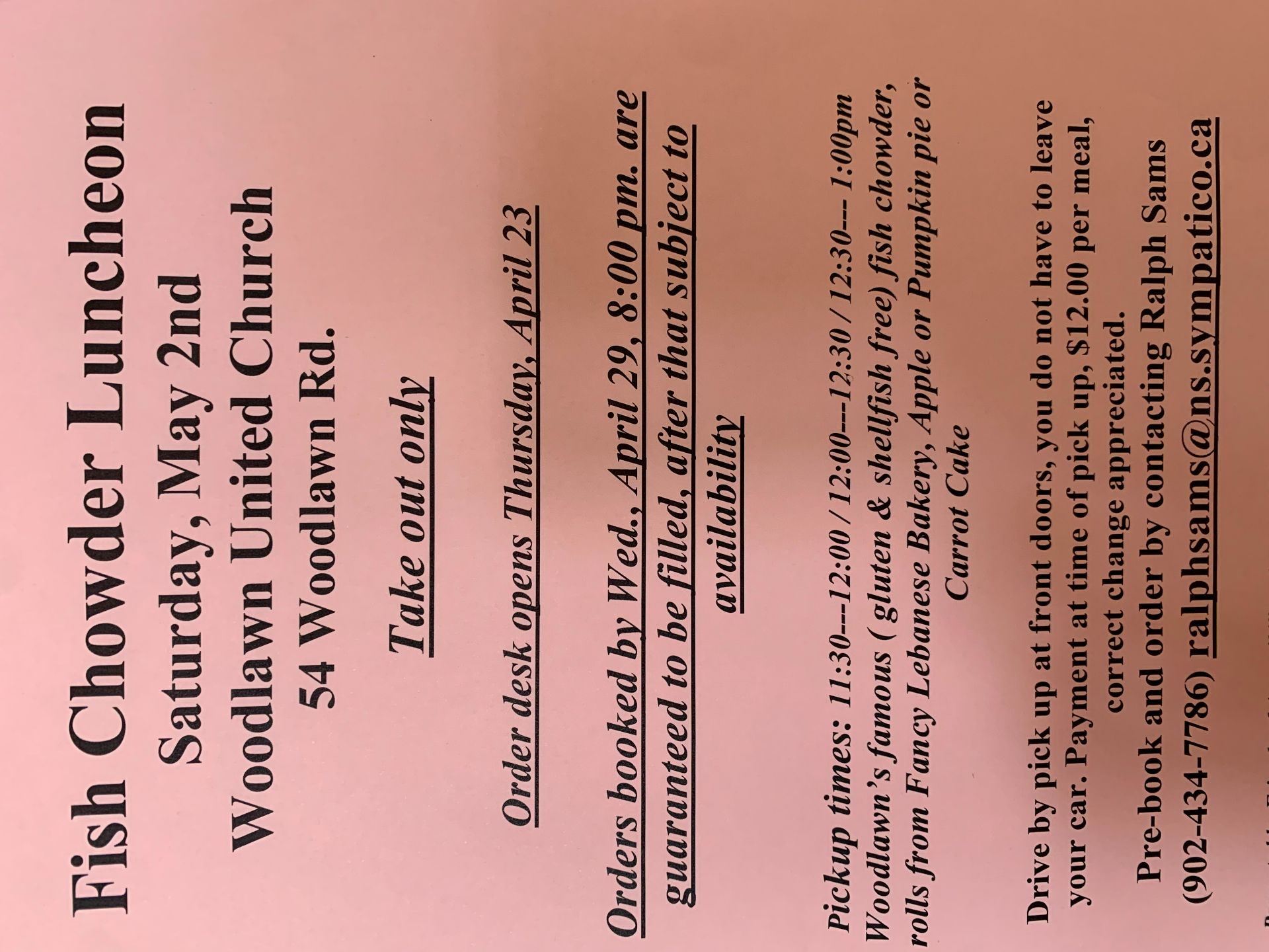 Before I tell you about the April 26th service I want to remind you about the Fish Chowder Lunch on Saturday May 2nd. If you want to order a fabulous $12 meal, with Ralph’s secret recipe, call Ralph at 902-434-7786 or email him at ralphsams@ns.sympatico.ca After Wednesday April 29th at 8 pm you can still try but there is no guarantee Ralph, and his hardworking team, can fill your order. See attachment for details.